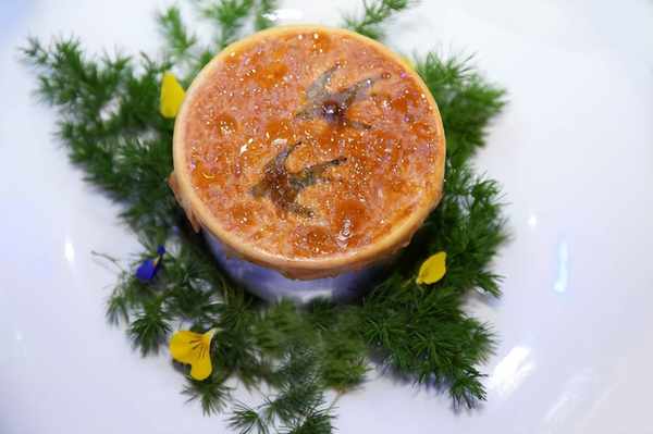 大董先生團隊為晚宴帶來瞭“卡普阿斯河的日出”,將現場氛圍推向瞭高潮。瑩潤的小仙燉鮮燉燕窩加裡曼之星浸潤在豆蓉羹中,搭配著南瓜味道,柔軟香濃,其間點綴小巧玲瓏的白蘿卜花,爽滑綿密之中更添爽脆。此道菜以卡普阿斯河日出之景為靈感,燕窩堆疊如朵朵白雲,簇擁著一輪初升旭日。