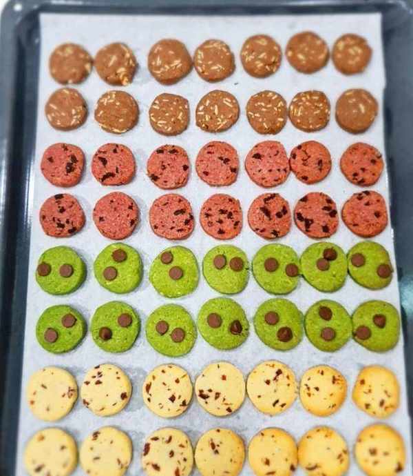 食譜(56塊餅幹=14塊/口味(圓直徑3.5厘米,厚0.5-0.7厘米)120克無鹽牛油(軟化)80克糖粉40克蛋黃4克香草精160克低筋面粉40克杏仁粉2克鹽=原味蔓越莓=7.5克低筋面粉10克蔓越莓幹=抹茶巧克力粒=2克低筋面粉3克抹茶粉15克巧克力粒=紅絲絨奧利奧=4克甜菜根粉1克無糖可可粉15克奧利奧=巧克力杏仁=5克無糖可可粉15克杏仁片(烤香)(冰庫冷凍1小時)(預熱烤箱170C:15分鐘)(上下火,不開旋風,中層烤)