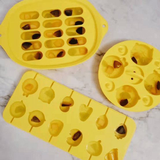 3、先把切好的水果放入模具中,再倒入果凍液體,蓋上蓋子,冰箱冷藏兩小時;