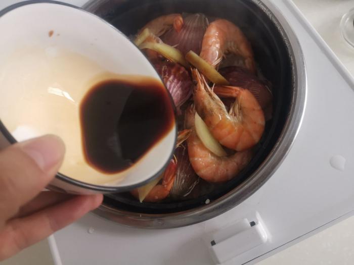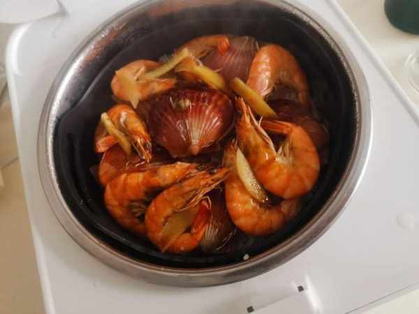 所用資料:大米2杯,鮮蝦適量,扇貝6只,醋1勺,生抽1勺,鹽適量,薑2片。