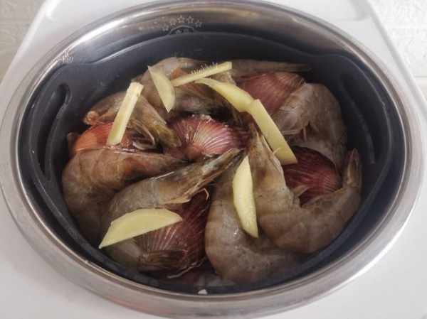第六步:這個時候把扇貝和鮮蝦均勻的鋪上,上面撒上薑絲去腥,這樣米飯經過煮會更好吃,而海鮮的鮮味也不會被帶走,蓋上蓋子繼續蒸米飯。