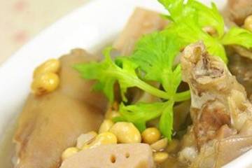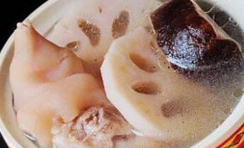 豬蹄含有豐富的膠原蛋白質,有美容養顏的功效,多吃豬蹄對皮膚很有好處。豬蹄用火燒皮後,用小刀刮洗幹凈,砍成小塊,與蓮藕一同燉煮。燉煮熟後,豬蹄糯,蓮藕面,湯味鮮。豬蹄蓮藕原味食用,或者搭配蘸碟食用,都不錯。