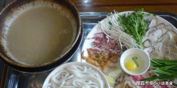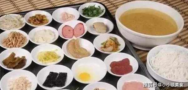 過橋米面團分為四個部分。首先是湯頭上覆蓋瞭一層沸騰的油,聞起來很香。二是辣椒油、辣椒粉等調味品,三是主料是雞肉或肉片等,味道濃鬱。第四種是米粉。很特別,每一個都是分開的,吃的時候把米粉放進湯裡要等很久。