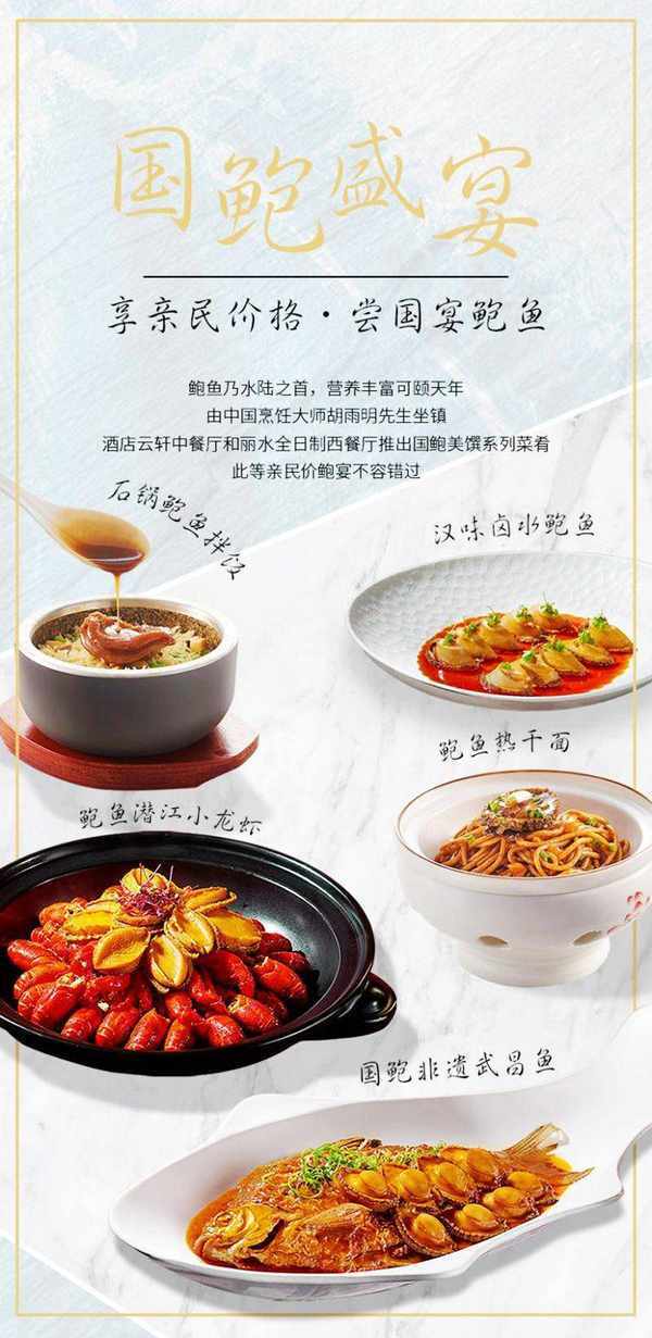 鮑魚乃水陸之首,營養豐富可頤天年,中國烹飪大師胡雨明先生坐鎮,帶領廚師團隊以精巧高超的廚藝成就萬千肴變,於酒店雲軒中餐廳及麗水全日西餐廳,點燃眾口舌尖。