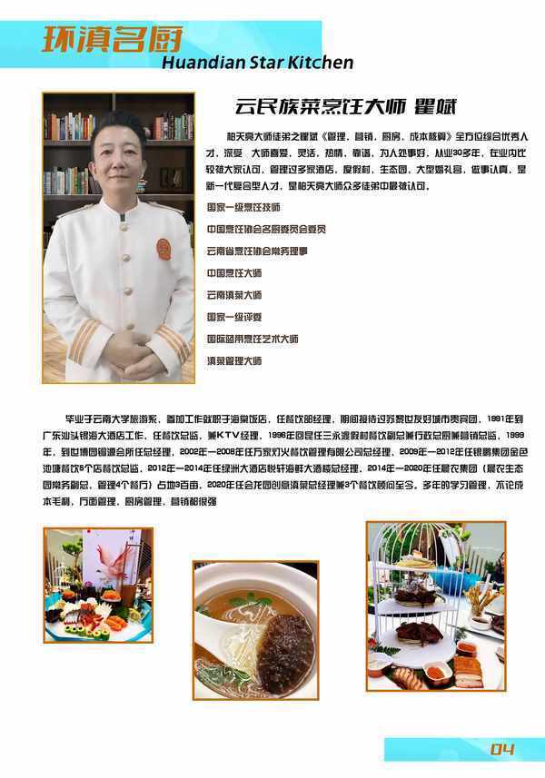 瞿斌 男 1970年7月7日 畢業於雲南大學旅遊系,參加工作就職於海棠飯店,任餐飲部經理,期間接待過蘇黎世友好城市貴賓團,1991年到廣東汕頭銀海大酒店工作,任餐飲總監,兼KTV經理,1996年回昆任三永渡假村餐飲副總兼行政總廚兼營銷總監,1999年,到世博園銅源會所任總經理,2002年一2008年任萬傢燈火餐飲管理有限公司總經理,2009年一2012年任銀鵬集團金色池塘餐飲5個店餐飲總監,2012年一2014年任綠洲大酒店悅軒海鮮大酒樓總經理,2014年一2020年任晨農集團(晨農生態園常務副總,管理4個餐廳)占地3百畝,2020年任會龍園創意滇菜總經理兼3個餐飲顧問至今。 多年的學習管理,不論成本毛利,廳面管理,廚房管理,營銷都很強