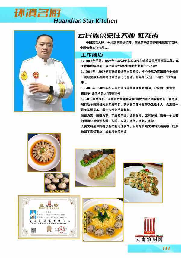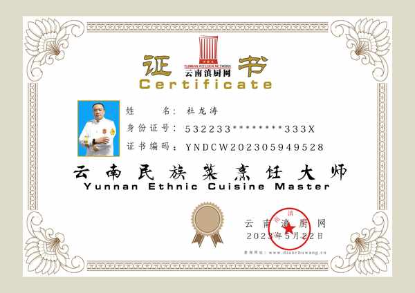 中國烹飪大師,中式烹調高級技師,高級公共營養師,高級健康管理師,中國飲食文化傳承人,雲南民族菜烹飪大師,雲南滇廚網副主任。