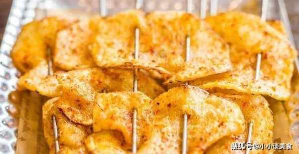 第二種:烤薯片。無論搭配什麼土豆,都是極品。煮熟後也很好吃。它外面酥脆,裡面柔軟。很多人喜歡它。但是烤肉店的薯片也很貴。每串隻有幾片,而且切得很薄。但是還是有很多人喜歡!