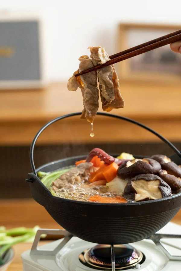京都壽喜鍋 京都傳統壽喜鍋濃鬱而低脂的湯底 滲透著蔬菜和牛肉的香氣 湯底帶著絲絲鮮甜,吃一口停不下來的節奏。