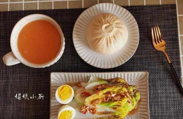 五、西紅柿胡蘿卜飲/全麥肉餡包子/水煮白菜心