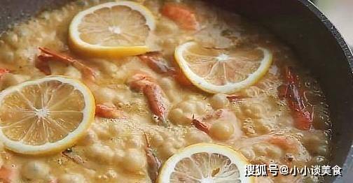 倒入大蝦煮至變色,然後將汁液濾入鍋中,以中火煮熟調味並準備檸檬角。