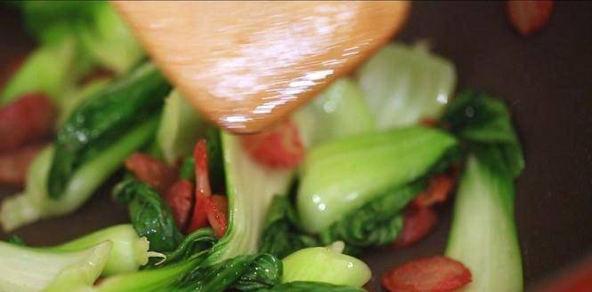 6.鍋中加入臘腸翻炒到香腸發白後,加入洗幹凈瀝幹水的青菜秧翻炒
