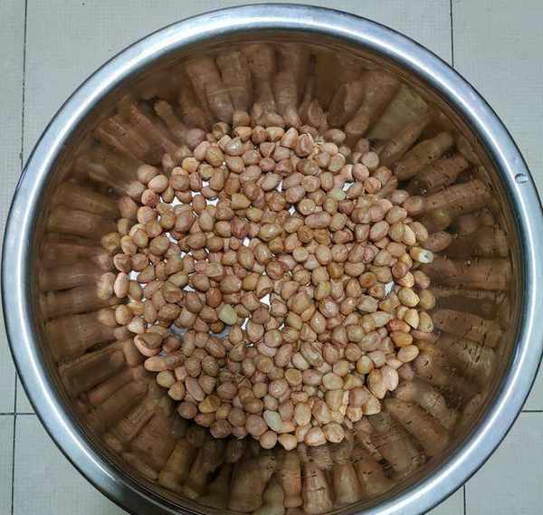 如果選用的是隔年的幹花生,建議浸泡三五分鐘,再瀝幹水分備用。