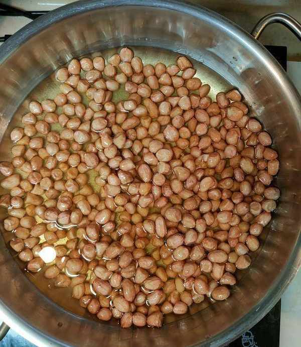 如果選用的是新下來的花生米,含有一定的水分的,不需要浸泡,直接瀝幹像上圖所示沒有水滴即可。不用完全擦幹。