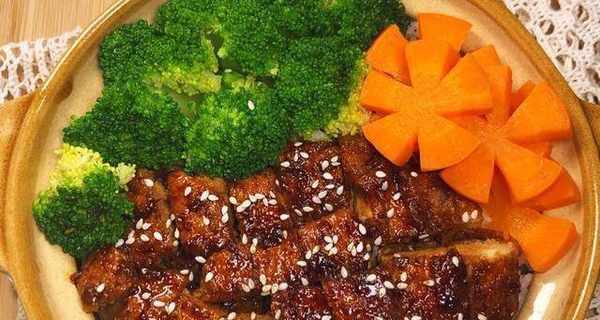 3:雞排切條狀,碗裡裝米飯,把雞排和蔬菜擺入碗裡,淋上照燒汁即可。