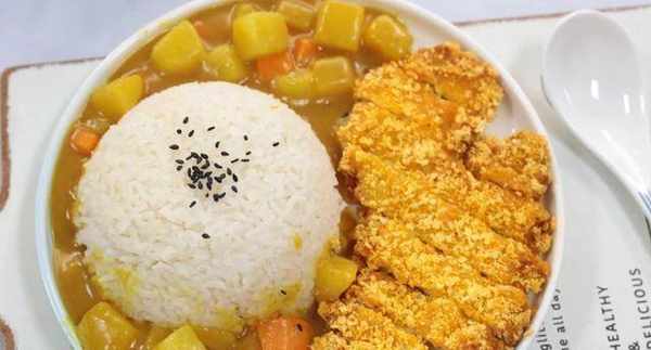 6、最後盛一碗米飯,雞排切塊,淋上咖喱汁就可以吃啦
