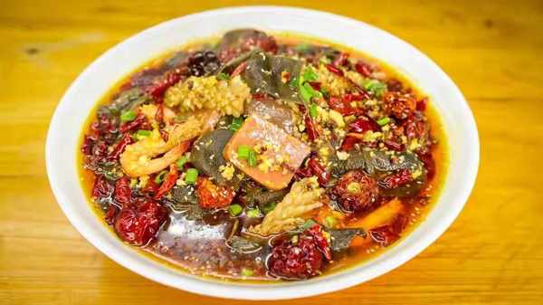 8、接著是剛才汆煮過的所有葷菜,多煮一會入味,淋上一點白酒,熱氣一激,煮個一兩分鐘就管出鍋瞭。最後再燙毛肚,默數八個數立馬出鍋,再煮就不脆、嫩瞭。再舀幾勺湯。