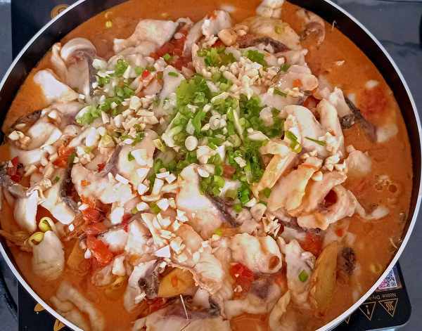 4、把醃好的魚片放入煮開魚湯的鍋中,不著急翻動魚片,待煮一分鐘後再輕輕攪一下,煮兩三分鐘待魚片變熟就可以起鍋到提前平鋪好黑木耳黃豆芽和魚骨的鍋中,加入蒜末蔥花澆上熱油即可。