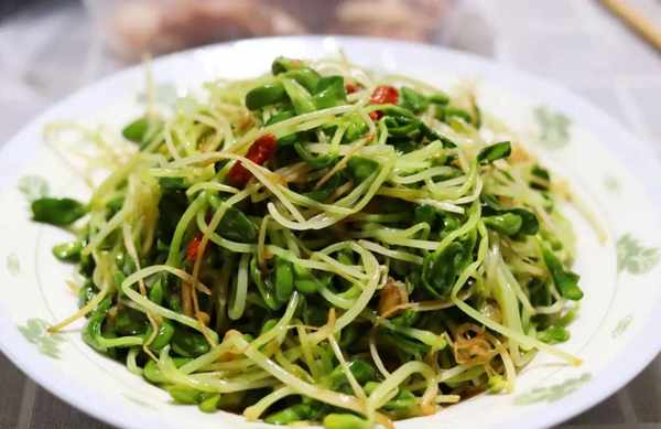 第五步:將豆苗倒入鍋中,大火翻炒片刻,加入2勺生抽,適量的鹽,翻炒均勻即可出鍋。