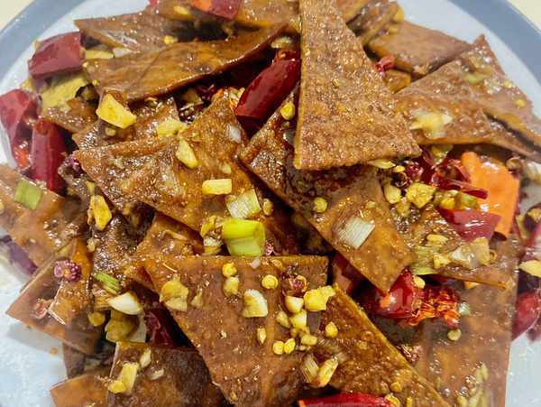 1、豆幹切成三角形備用。配料:大蔥、花椒、蒜末,香葉、桂皮、幹辣椒。