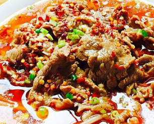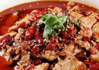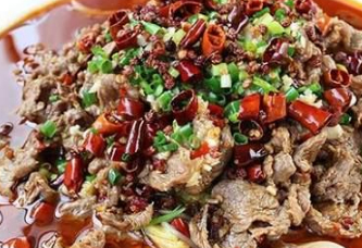 水煮牛肉:將牛裡脊去筋後切成4.5厘米長,0.3厘米厚,3厘米寬的大片(橫筋切片),沖凈血水後擠幹水分,用蛋清,料酒6克,川鹽1克,淀粉碼拌上漿。萵筍尖切成6厘米長的段,芹菜,蒜苗切成4.5厘米的段將炒鍋置於火上,加入菜油15克,中大火燒至四成熱,下芹菜,蒜苗,萵筍尖炒至斷生墊入碗底。另取一炒鍋置於火上,加入菜籽油20克,中火燒至三成熱,下郫縣豆瓣,薑末,蒜末入鍋炒香至油呈紅色,加鮮湯燒開,用漏勺將豆瓣渣子撈凈,轉小火後將上漿的牛肉逐一放入鍋中劃散,煮至牛肉斷生,加川鹽1克,料酒4克,味精,白糖,香油調味,再用水淀粉收汁出鍋,倒入墊有素菜的碗內。將刀口辣椒面均勻撒在煮熟的牛肉上。另將幹凈炒鍋置於火上,加入50克菜籽油,大火燒至七成熱,淋在刀口辣椒上成菜,可加香菜或芹菜葉點綴。