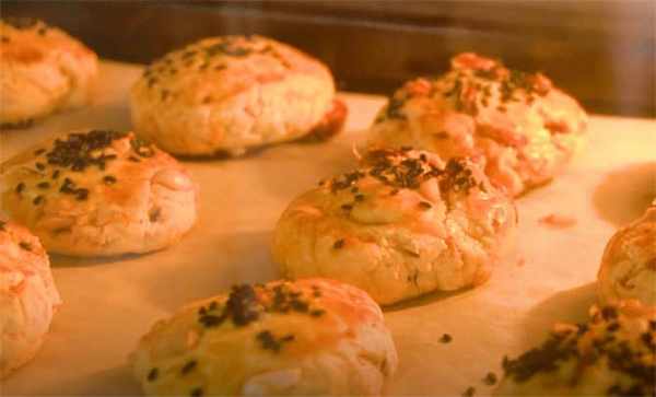 4.都做好之後放入烤盤裡,表面刷一層食用油,撒黑芝麻。