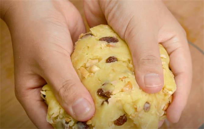 2.碗中倒入60g融化好的黃油,20g白糖,用蛋抽攪拌均勻,然後少量多次的加入150g低筋面粉,一邊倒一邊攪拌,攪拌成面絮,倒入花生碎,我這裡又加瞭葡萄幹,下手抓捏成一個面團,這裡要特別註意不要使勁揉,避免面粉起筋,蓋上保鮮膜餳上10分鐘。