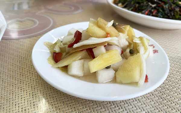 這個開胃小菜,據說隻要在這邊吃飯,都是免費送的,酸酸的的吃著會讓你特別的開胃,這個也是當地的一個特色,隻要是吃飯,不管是自己傢裡,還是在外面吃飯,哪怕是宴席,都會有一碗醃菜端上桌。