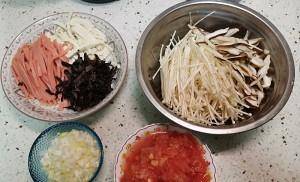西紅柿去皮切丁(越細越好)。將蔥切成切碎的蔥。火腿腸、黑蘑菇、豆腐切塊;金針菇撕開,香菇去根切片。