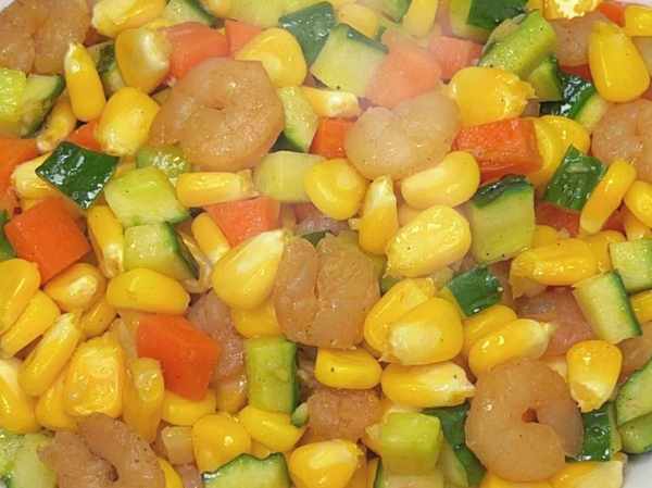 食材準備:大蝦、玉米、胡蘿卜丁、黃瓜、蒜末、胡椒粉。