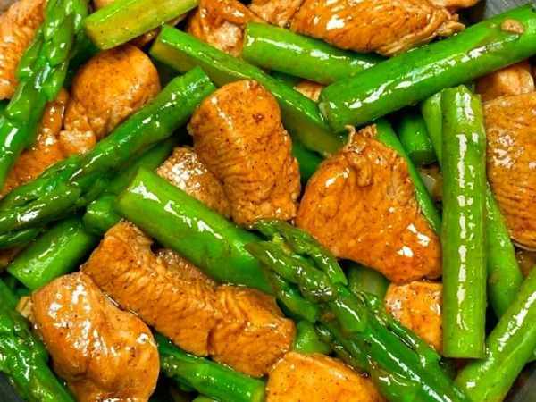 4.另熱鍋燒油,油熱以後,放入蒜末爆香,接著倒入蘆筍大火翻炒幾下,接著倒入炒好的雞身材肉翻炒均勻,淋入適量的蠔油提鮮,繼續翻炒均勻入味,即可出鍋開吃。