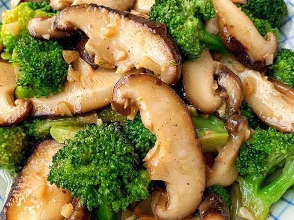 3.炒香菇變軟以後,再倒入西蘭花一起翻炒均勻,然後加入適量的食鹽、胡椒粉、生抽和蠔油,繼續翻炒均勻入味,即可出鍋開吃。