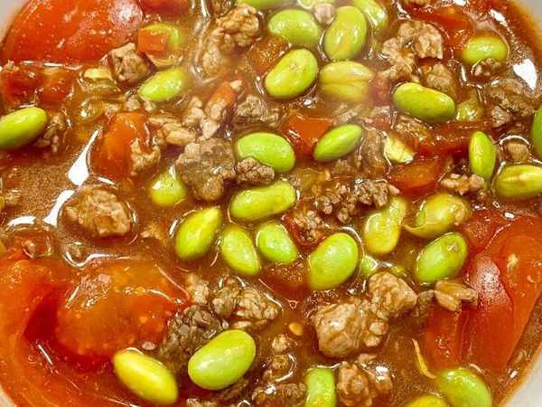 3.另熱鍋燒油,油熱以後,放入番茄丁煸炒,煸炒至番茄汁後,再倒入毛豆一起翻炒均勻,接著倒入適量的開水,燜煮五分鐘。