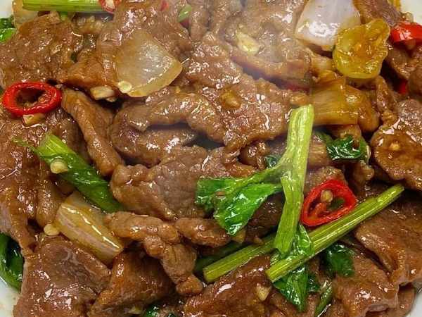 3.最後放入牛肉一起翻炒均勻,淋入少量的蠔油提鮮,繼續翻炒均勻入味,即可出鍋開吃。