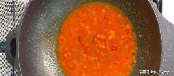 在平底鍋中加熱油。油熱後,加入適合炒香的蔥花,然後加入切好的西紅柿。炒好顏色後,加入適量的水煮沸。