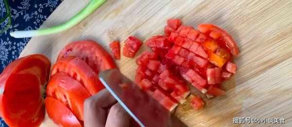 然後,先把新鮮的西紅柿去皮(用刀切開頂部,然後在沸水中焯幾秒),然後切成方塊,如上圖。