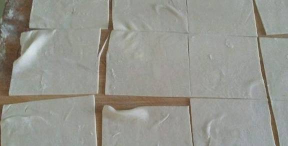 第二步,把醒好的面團搟成一張小面片,大約2毫米切成6厘米大小正方形的小面片。