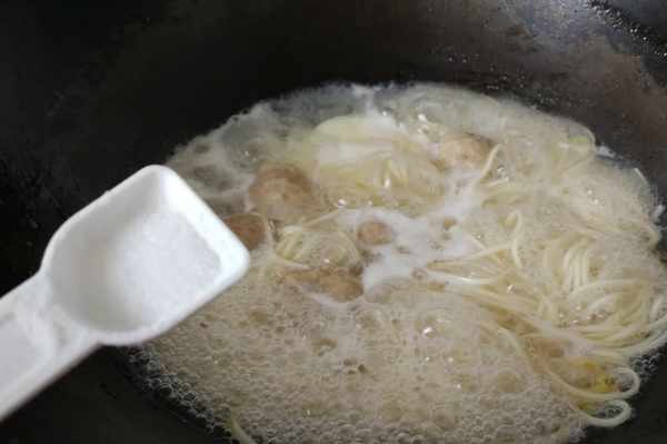 5、根據個人口味放入適量鹽。掛面本身就有鹽,所以鹽的用量一定要少一點。提醒大傢一點:購買掛面的時候註意看看配料表中鈉的含量,越低越好,更有利於我們的身體健康。