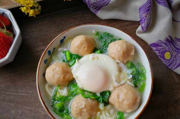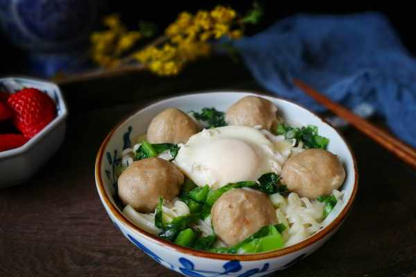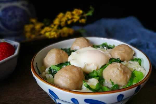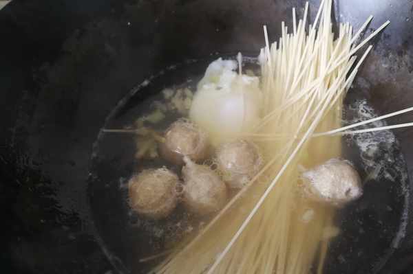 4、水還沒有燒開時,磕入一個雞蛋,中小火慢煮,煮到雞蛋表面凝固後放入牛肉丸和掛面。有好多人都問我為什麼煮這種雞蛋總是泡沫滿鍋飛,原因有兩種:一是雞蛋不夠新鮮,蛋白散開瞭,入鍋一煮就成白沫子;二是不能在水沸騰的時候放雞蛋,得在水燒至四周冒小泡泡時下鍋,小火煮就不容易出現泡沫。