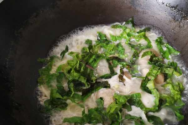 6、出鍋前一分鐘放入適量萵筍葉。萵筍葉的營養成分比萵筍桿子還高,可千萬別隨手扔掉瞭,用來下面條味道非常好。當然您也可以用其他綠葉蔬菜來代替。