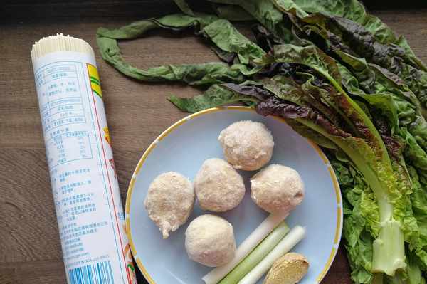 1、將所有主食材準備齊全,掛面,牛肉丸,生薑,大蔥,萵筍葉。掛面您也可以用濕面來代替,牛肉丸是冷凍的,萵筍葉也可以用其他綠葉蔬菜來代替。