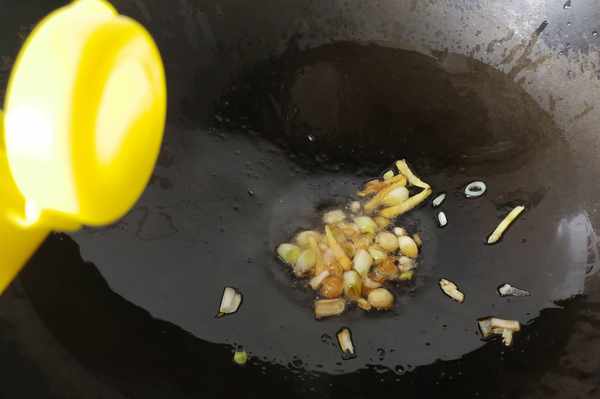 2、鍋中放入適量花生油,先放入生薑和蔥白小火爆鍋,炒出香味後放幾滴醬油上色。