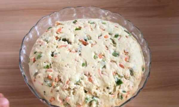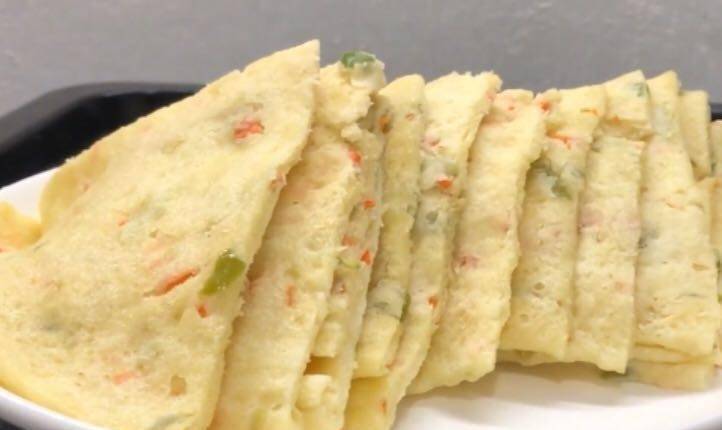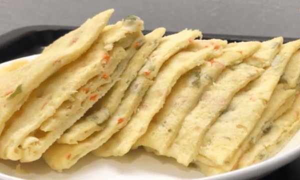 1、先將大米洗凈,加水稍微浸泡一下。然後準備青椒丁和紅蘿卜丁,備用。2.米浸泡至捏碎,瀝幹水分,將2個雞蛋放入大碗中,放入料理機中攪拌至順滑。然後倒入一個大碗裡,加入泡打粉3克,鹽3克,加入青椒丁和胡蘿卜丁拌勻,再加入面粉,拌勻成面團,蓋上保鮮膜。包裝和證明體積會更大。3.將發酵好的面團取出揉勻,直到吸出空氣,然後分成大小相等的面團,每一個面團搓圓,壓扁,搟薄,抹上油,繼續下一個。片材,將其折疊起來,進一步塗油,將其展開,折疊起來並放在一邊。