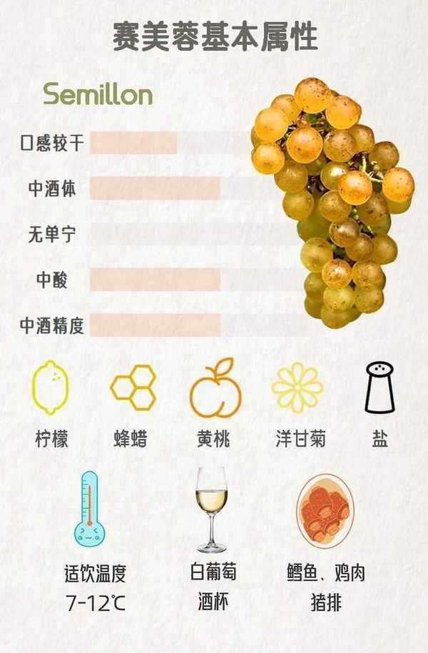 賽美蓉(Semillon)易於栽培,生命力旺盛。它可以為鼎鼎大名的甜酒蘇玳(Sauternes)帶來飽滿的酒體和圓潤的質地,也可以釀造成過桶的幹白,味道與霞多麗相似。