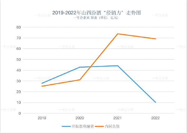 也就是說,山西汾酒在過去四年間加大瞭渠道銷貨力度,主要采用的方式是以應收款項融資的授信模式,並在2021年達到巔峰狀態,既實現瞭合同負債的最大化,也對經銷商實現瞭最大程度的掌控力。