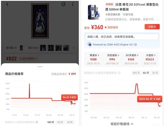 而批價受壓制,也進一步影響瞭商品終端的銷售。據網絡數據顯示,青花20、青花30復興版的售價均創下瞭近半年的新低。