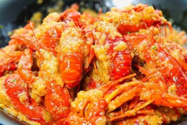 4、把小龍蝦盛出來瞭後,把剩餘的四分之一的蒜蓉放到小龍蝦上面,燒一些熱油,淋到蒜蓉上即可。