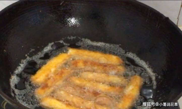 5.鍋燒熱,加入更多的油,用筷子試一下油溫,看有沒有小氣泡,加入牛奶條,小火慢慢煎,煎至一面金黃,翻面再煎另一面炸至金黃,起鍋瀝幹,幹油即可裝盤,趁熱食用。外皮酥脆,內裡柔軟。比較適合小孩和老人吃,很香。預防: