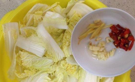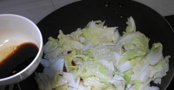 白菜洗凈,切成薄片,將白菜葉和白菜葉分開。然後將醋、鹽、糖、生抽等調味料放入碗中,加入少許淀粉,攪拌均勻備用。鍋裡放油,放花椒炒香,加入幹辣椒一起翻炒,然後放入薑蒜,先放白菜,因為比較硬,需要炒的時間長一些時間。