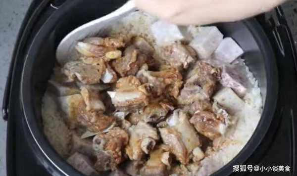 2.芋頭洗凈,去皮切塊,裝盤待用。3、取適量大米洗凈,洗幹凈後放入電飯鍋,然後把山藥放在米飯上面,再把醃制好的排骨放在山藥上面,像這樣攤平,最後放入清水,水和米的比例為1:1,蓋上蓋子,按下煮飯鍵開始煮飯。