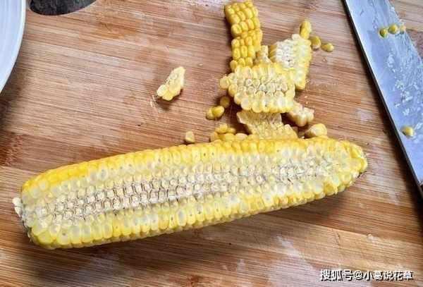 將甜玉米用微波爐加熱3分鐘至熟,用刀從上到下垂直切,玉米粒很容易得到
